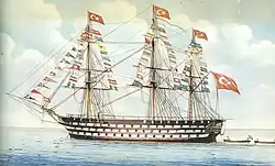 Following the loss of Greece after the Battle of Navarino against the combined British-French-Russian flotilla in 1827, Mahmud II gave top priority to rebuilding a strong Ottoman naval force. The first steamships of the Ottoman Navy were acquired in 1828. In 1829 the world's largest warship for many years, the 201 x 56 kadem (1 kadem = 37.887 cm) or 76.15 m × 21.22 m (249.8 ft × 69.6 ft) ship of the line Mahmudiye, which had 128 cannons on three decks and carried 1280 sailors on board, was built for the Ottoman Navy at the Imperial Arsenal on the Golden Horn (kadem, which translates as "foot", is often misinterpreted as equivalent in length to one imperial foot, hence the wrongly converted dimensions of "201 x 56 ft, or 62 x 17 m" in some sources.)