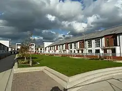 Two years later approval was given for a new housing development to be built on the site, consisting of 474 homes.[35] There is a public art display commemorating the stadium and features a circular plate half open, symbolising the centre spot and the new emerging development which now sits on the Maine Road stadium.[36][37]