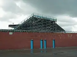 The era of standing accommodation at Maine Road came to an end in May 1994 as the stadium became all-seater to comply with the requirements of the Taylor Report, with the demolition of the Kippax Street Terrace, which, unusually for an all-standing area, was located at the side of the pitch instead of behind the goals. The final match with standing permitted took place on 30 April 1994,[21] against Chelsea for a 2–2 draw. Immediately before demolition, the capacity of the Kippax terrace was 18,300.[19] A three-tier stand was built in its place, holding nearly 14,000 spectators, and on its completion in October 1995 it was the tallest stand in the country, built at a cost of £16 million, four times the turnover of the club, according to then-chairman Francis Lee.[22] The revamp of the Kippax was the second phase of a five-part development plan that would have cost £40million[23] and increased the stadium's capacity to 45,024. However, the club abandoned these plans as City were relegated from the Premier League in 1996 and from Division One two years later.[23]