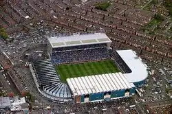 During construction, the stadium was reputedly cursed by a Gypsy when officials evicted a Gypsy camp from the area. This curse was allegedly removed on 28 December 1998.[12] However, the Gypsy curse is likely to be an urban myth, as such stories are endemic to a number of Football League grounds. Construction took 300 days at a total cost of £100,000.[2] The initial layout of the ground consisted of one covered stand with a seating capacity of 10,000, and uncovered terracing on the other three sides, with gentle curves connecting the corners.[13]
