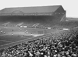 The first match at Maine Road took place on 25 August 1923 when 58,159 fans watched Manchester City beat Sheffield United 2–1.[14] The first changes to the ground took place in 1931, when the corner between the Main Stand and the Platt Lane end at the south of the ground was rebuilt to incorporate a roof.[1] This renovation was the first of many, as Maine Road's layout and capacity was varied throughout its lifespan.
