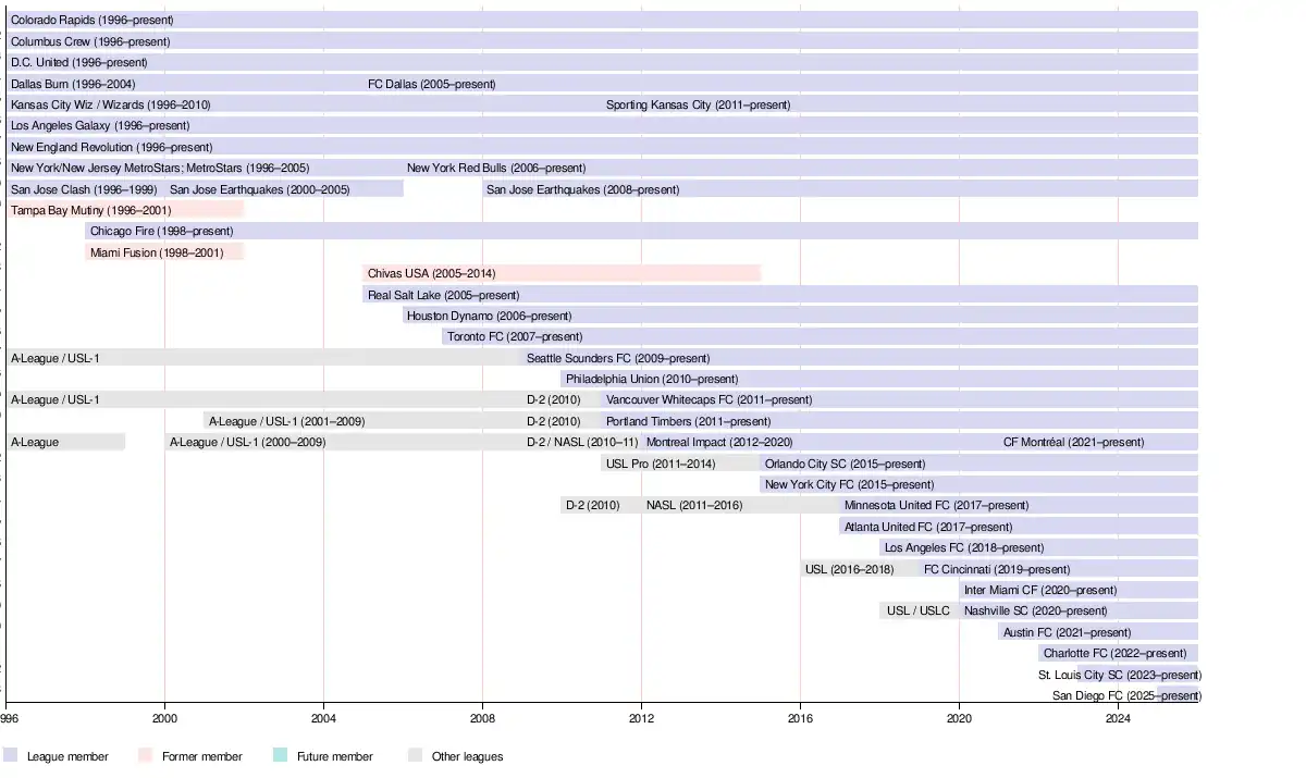 The league's 30 clubs are divided between the Eastern and Western conferences. MLS has regularly expanded since the 2005 season, most recently with the addition of San Diego FC in 2025.[145]