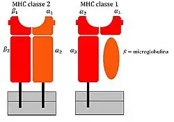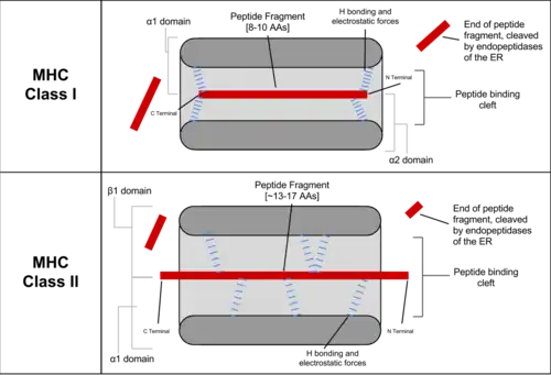 | Composition of the stable peptide-MHC complex | Polymorphic chain α and β2 microglobulin, peptide bound to α chain | Polymorphic chains α and β, peptide binds to both |