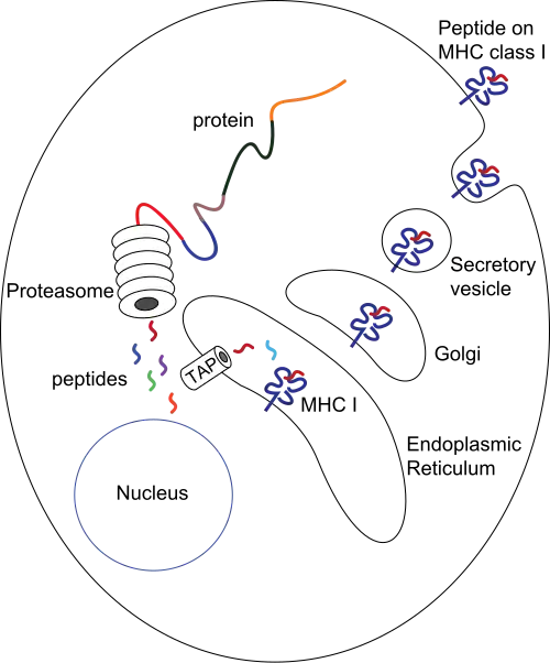 - In MHC class I, any nucleated cell normally presents cytosolic peptides, mostly self peptides derived from protein turnover and defective ribosomal products. During viral infection, intracellular microorganism infection, or cancerous transformation, such proteins degraded in the proteosome are as well loaded onto MHC class I molecules and displayed on the cell surface. T lymphocytes can detect a peptide displayed at 0.1–1% of the MHC molecules.