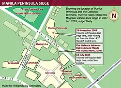 - ^ "Afp.google.com, Philippine rebels seize hotel, demand Arroyo step down: witnesses". November 28, 2007. Archived from the original on March 6, 2012. Retrieved November 29, 2011.