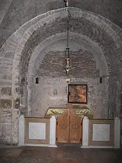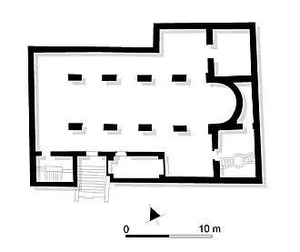 Already at the time of the foundation of Dongola contacts were maintained with the Byzantine Empire.[21] In the 530s, the Byzantines under Emperor Justinian mounted a policy of expansion. The Nubians were part of his plan to win allies against the Sasanian Persians by converting them to Christianity, the Byzantine state religion. The imperial court, however, was divided in two sects, believing in two different natures of Jesus Christ: Justinian belonged to the Chalcedonians, the official denomination of the empire, while his wife Theodora was a Miaphysite, who were the strongest in Egypt. John of Ephesus described how two competing missions were sent to Nubia, with the Miaphysite arriving first in, and converting, the northern kingdom of Nobatia in 543. While the Nobatian king refused Justinian's mission to travel further south[22] archaeological records might suggest that Makuria converted still in the first half of the 6th century.[23] The chronicler John of Biclar recorded that in around 568 Makuria had “received the faith of Christ”. In 573 a Makurian delegation arrived in Constantinople, offering ivory and a giraffe and declaring its good relationship with the Byzantines. Unlike Nobatia in the north (with which Makuria seemed to have been in enmity)[24] and Alodia in the south Makuria embraced the Chalcedonian doctrine.[25] The early ecclesiastical architecture at Dongola confirms the close relations maintained with the empire,[24] trade between the two states was flourishing.[26]