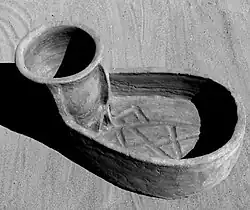 Shinnie refers to Nubian pottery as the "richest indigenous pottery tradition on the African continent." Scholars divide the pottery into three eras.[206] The early period, from 550 to 650 according to Adams, or to 750 according to Shinnie, saw fairly simple pottery similar to that of the late Roman Empire. It also saw much of Nubian pottery imported from Egypt rather than produced domestically. Adams feels this trade ended with the invasion of 652; Shinnie links it to the collapse of Umayyad rule in 750. After this domestic production increased, with a major production facility at Faras. In this middle era, which lasted until around 1100, the pottery was painted with floral and zoomorphic scenes and showed distinct Umayyad and even Sassanian influences.[207] The late period during Makuria's decline saw domestic production again fall in favour of imports from Egypt. Pottery produced in Makuria became less ornate, but better control of firing temperatures allowed different colours of clay.
