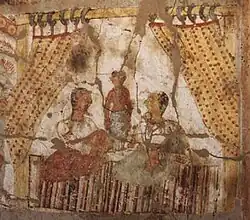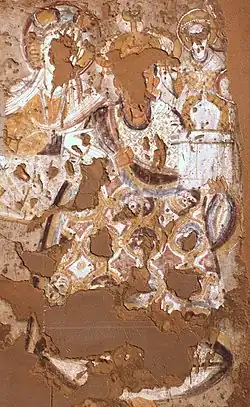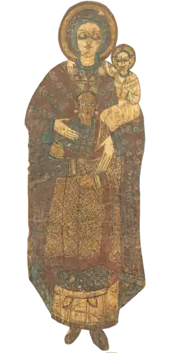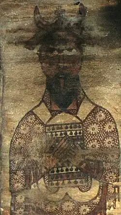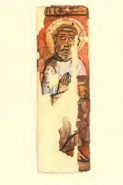 As of 2019, around 650 murals distributed over 25 sites have been recorded,[203] with more paintings still awaiting publication.[204] One of the most important discoveries of the rushed work prior to the flooding of Lower Nubia was the Cathedral of Faras. This large building had been completely filled with sand preserving a series of paintings. Similar, but less well preserved, paintings have been found at several other sites in Makuria, including palaces and private homes, giving an impression of Makurian art. The style and content was heavily influenced by Byzantine art, and also showed influence from Egyptian Coptic art and from Palestine.[205] Mainly religious in nature, it depicts many of the standard Christian scenes. Also illustrated are a number of Makurian kings and bishops, with noticeably darker skin than the Biblical figures.