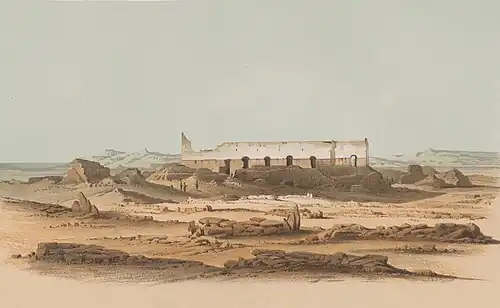 In 1171 Saladin overthrew the Fatimid dynasty, which signaled new hostilities between Egypt and Nubia.[83] The following year[106] a Makurian army pillaged Aswan and advanced even further north. It is not clear if this campaign was intended to aid the Fatimids or was merely a raid[83] exploiting the unstable situation in Egypt[107] The latter seems more likely, however, as the Makurians apparently soon withdrew.[108] A subsequent expedition by Saladin's brother Turan-Shah conquered Qasr Ibrim in January 1173,[109] reportedly sacking it and converting its church into a mosque.[110] King Moses Georgios, who probably ruled over both Makuria and Alodia,[92] initiated peace negotiations, but in vain.[111] A detachment of Kurdish troops stationed in Qasr Ibrim would raid Lower Nubia for the next two years until in 1175 a Nubian army finally arrived to confront the invaders at Adindan near Faras. Before battle, however, the Kurdish commander drowned in the Nile, resulting in the retreat of Saladin's troops out of Nubia.[112] Afterwards peace seems to have prevailed and Nubian affairs were not discussed by foreign observers for nearly a century.[113]