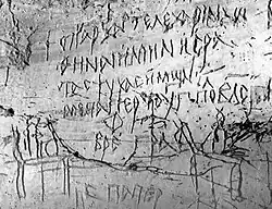Beside Nubian there existed three other languages in medieval Nubia: Greek, Coptic and Arabic.[183] Greek is the language that is attested the most often.[184] It was a highly prestigious sacral language associated with the Christian Scriptures and the liturgy.[185] Ostraca with receipts for the shipment of grain suggest that Greek may have also been used for administrative and commercial purposes during the 6th–8th centuries.[186] Funerary stelae, which were produced until the 12th century,[187] often featured a rather sophisticated Greek following late antique models.[186] Late inscriptions, however, show that over time Greek in Makuria became increasingly "Nubianized".[188]