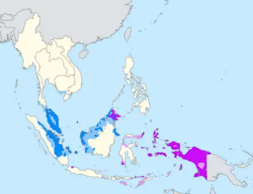 - ^ Since the standardized varieties of Indonesia, Malaysia, Brunei and Singapore are structurally largely identical and mostly differ in lexicon and to a lesser degree in phonetic details, the umbrella terms "Malay/Indonesian"[15] or "Malay-Indonesian"[16] are often used in the linguistic literature when discussing the structure or history of the language.