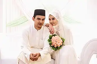 A Malay couple in traditional attire after their marriage ceremony (akad nikah). The groom is wearing a baju melayu with songkok and songket, while the bride wears baju kurung with a tudong.