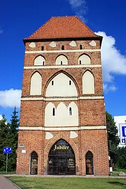 The Teutonic Order weakened greatly after the Battle of Grunwald against advancing Poles and Lithuanians.[7] The town was burned by the Teutonic Knights in 1410 before the siege of the castle by Poles,[6] however it remained under Teutonic control after the siege. In 1457, during the Thirteen Years' War, the castle was sold to Poland by Czech mercenaries of the Teutonic Knights,[6] and the Teutonic Order transferred its seat to Königsberg (now Kaliningrad, Russia). The town, under Mayor Bartholomäus Blume and others, resisted the Poles for three further years. But when the Poles finally took control, Blume was hanged and quartered, and fourteen officers and three remaining Teutonic knights were thrown into dungeons, where they met a miserable end.[3] A monument to Blume was erected in 1864,[4] after the town's annexation by Prussia in the Partitions of Poland.