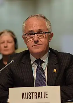 Malcolm Bligh Turnbull (born 24 October 1954) is an Australian former politician, businessman and barrister who served as the 29th prime minister of Australia from 2015 to 2018. He held office as leader of the Liberal Party from 2008 to 2009 and again from 2015 to 2018, and was the member of parliament (MP) for the New South Wales division of Wentworth from 2004 to 2018.