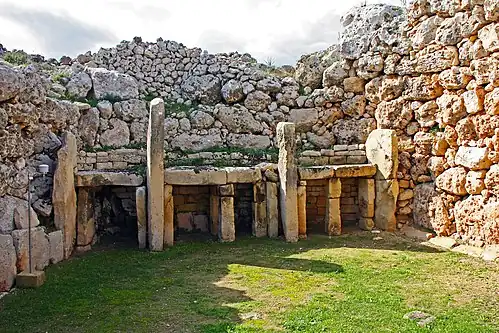 Malta has been inhabited from at least c. 6500 BC, with the arrival of Mesolithic hunter-gatherers likely originating from Sicily. Discoveries at Latnija Cave led by the Maltese archaeologist Eleanor Scerri included the remains of hearths, stone tools and an abundant and diverse range of animal bones. These included indigenous red deer that are now extinct, fish and marine mammals, as well as abundant edible marine gastropods. To arrive on Malta, these hunter-gatherers had to cross around 100 km of open water, documenting the longest yet-known sea crossing by hunter-gatherers in the Mediterranean.[25] The extinction of the dwarf hippos, giant swans and dwarf elephants has historically been linked to the earliest arrival of humans on Malta.[53] However this seems unlikely since recent work suggests these animals went extinct many thousands of years before the arrival of the first people,[54] and no such animals were found in association with the earliest known Mesolithic hunter-gatherers.[25] The claim for an earlier occupation of the island by Neanderthals is widely rejected.[25] Supplementary Information Neolithic Farmers, also originating from Sicily, are thought to have arrived on the islands by around 5400 BC.[25] Prehistoric farming settlements dating to the Early Neolithic include the Għar Dalam cave site in the uppermost layers associated with domesticated animals.[55] The Neolithic population on Malta grew cereals, raised livestock and, in common with other ancient Mediterranean cultures, worshipped a fertility figure.[56]