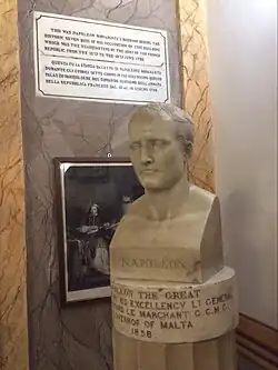 The Knights' reign ended when Napoleon captured Malta on his way to Egypt during the French Revolutionary Wars in 1798. During 12–18 June 1798, Napoleon resided at the Palazzo Parisio in Valletta.[110][111][112] He reformed national administration with the creation of a Government Commission, twelve municipalities, a public finance administration, the abolition of all feudal rights and privileges, the abolition of slavery and the granting of freedom to all Turkish and Jewish slaves.[113][114] On the judicial level, a family code was framed and twelve judges were nominated. Public education was organised along principles laid down by Bonaparte himself, providing for primary and secondary education.[114][115] He then sailed for Egypt, leaving a substantial garrison in Malta.[116]