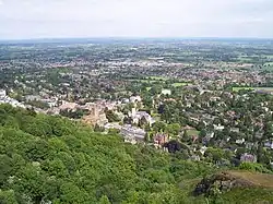 At the 2021 census it had a population of 30,462.[1] It includes Great Malvern on the steep eastern flank of the Malvern Hills, as well as the former independent urban district of Malvern Link. Many of the major suburbs and settlements that comprise the town are separated by large tracts of open common land and fields, and together with smaller civil parishes[5] adjoining the town's boundaries and the hills, the built up area is often referred to collectively as The Malverns.[6]
