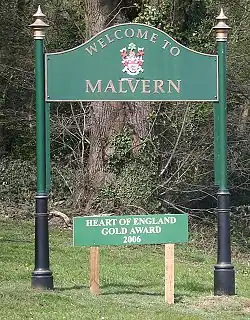 Malvern (/ˈmɔːlvərn, ˈmɒl-/, locally also: /ˈmɔːvərn/)[2][3] is a spa town and civil parish in Worcestershire, England.[4] It lies at the foot of the Malvern Hills, a designated Area of Outstanding Natural Beauty. The centre of Malvern, Great Malvern, is a historic conservation area, which grew dramatically in Victorian times due to the natural mineral water springs in the vicinity, including Malvern Water.