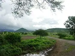 The plateau is an extension of the Deccan Traps, formed between 60 and 68 million years ago[18][19] at the end of the Cretaceous period. In this region the main classes of soil are black, brown and bhatori (stony) soil. The volcanic, clay-like soil of the region owes its black colour to the high iron content of the basalt from which it formed. The soil requires less irrigation because of its high capacity for moisture retention. The other two soil types are lighter and have a higher proportion of sand.