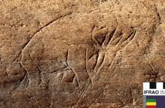 Evidence that humans interacted with mammoths extends back to around 1.8 million years ago, with a number of bones of Mammuthus meridionalis from the Dmanisi site in Georgia having marks suggested to be the result of butchery by archaic humans, likely as a result of scavenging.[49] During the Last Glacial Period, modern humans hunted woolly mammoths,[50] used their remains to create art and tools,[51][50] and depicted them in works of art.[51] Woolly mammoth bones were used as construction material for dwellings by both Neanderthals and modern humans during the ice age.[52] More than 70 such dwellings are known, mainly from the East European Plain. The huts' bases were circular, ranging from 8 to 24 m2 (86 to 258 sq ft). Large bones were used as foundations for the huts, tusks for the entrances, and the roofs were probably skins held in place by bones or tusks.[53] Remains of Columbian mammoths at a number of sites suggest that they were hunted by Paleoindians, the first humans to inhabit the Americas.[54] A probable bone engraving of a Columbian mammoth made by Paleoindians is known from Vero Beach, Florida.[55]