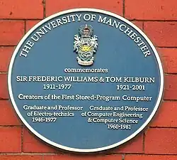The Manchester Baby, also called the Small-Scale Experimental Machine (SSEM),[1] was the first electronic stored-program computer. It was built at the Victoria University of Manchester by Frederic C. Williams, Tom Kilburn, and Geoff Tootill, and ran its first program on 21 June 1948.[2]
