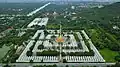 The new capital city site was 66 km2 (25.5 sq mi) in area, surrounded by four rivers. The plan called for a 144-square block grid patterned citadel, anchored by a 16 square block royal palace compound at the center by Mandalay Hill.[11] The 1,020-acre (413-hectare) citadel was surrounded by four 2,032 m (6,666 ft) long walls and a moat 64 m (210 ft) wide, 4.6 m (15 ft) deep. At intervals of 169 m (555 ft) along the wall, were turrets with gold-tipped spires for watchmen.[12] The walls had three gates on each side, and five bridges to cross the moat.[11] In addition, the king also commissioned the Kuthodaw Pagoda, the Pahtan-haw Shwe Thein Ordination Hall, the Thudamma zayats or public houses for preaching Buddhism and a library for the Pāli Canon.