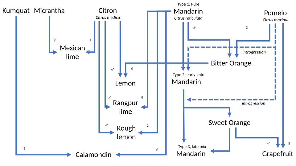 - ^ a b Curk, Franck; Ancillo, Gema; Garcia-Lor, Andres; Luro, François; Perrier, Xavier; Jacquemoud-Collet, Jean-Pierre; Navarro, Luis; Ollitrault, Patrick (2014). "Next generation haplotyping to decipher nuclear genomic interspecific admixture in Citrus species: analysis of chromosome 2". BMC Genetics. 15: 152. doi:10.1186/s12863-014-0152-1. PMC 4302129. PMID 25544367.