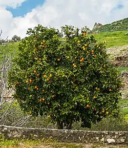 Citrus reticulata is a moderate-sized tree some 7.6 metres (25 ft) in height.[2][3] The tree trunk and major branches have thorns. The leaves are shiny, green, and rather small. The petioles are short, almost wingless or slightly winged. The flowers are borne singly or in small groups in the leaf-axils.[3] Citrus are usually self-fertile (needing only a bee to move pollen within the same flower) or parthenocarpic (not needing pollination and therefore seedless, such as the satsuma). A mature mandarin tree can yield up to 79 kilograms (175 lb) of fruit.[4]