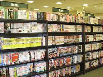 In the following years, manga became increasingly popular, and new publishers entered the field while the established publishers greatly expanded their catalogues.[142] The Pokémon manga Electric Tale of Pikachu issue #1 sold over 1 million copies in the United States, making it the best-selling single comic book in the United States since 1993.[143] By 2008, the U.S. and Canadian manga market generated $175 million in annual sales.[144] Simultaneously, mainstream U.S. media began to discuss manga, with articles in The New York Times,[145] Time magazine, The Wall Street Journal, and Wired magazine.[146] As of 2017, manga distributor Viz Media is the largest publisher of graphic novels and comic books in the United States, with a 23% share of the market.[147] BookScan sales show that manga is one of the fastest-growing areas of the comic book and narrative fiction markets. From January 2019 to May 2019, the manga market grew 16%, compared to the overall comic book market's 5% growth. The NPD Group noted that, compared to other comic book readers, manga readers are younger (76% under 30) and more diverse, including a higher female readership (16% higher than other comic books).[148] As of January 2020, manga is the second largest category in the US comic book and graphic novel market, accounting for 27% of the entire market share.[149] During the COVID-19 pandemic some stores of the American bookseller Barnes & Noble saw up to a 500% increase in sales from graphic novel and manga sales due to the younger generations showing a high interest in the medium.[150] Sales of print manga titles in the U.S. increased by 3.6 million units in the first quarter of 2021 compared to the same period in 2020.[151] In 2021, 24.4 million units of manga were sold in the United States. This is an increase of about 15 million (160%) more sales than in 2020.[152][153] In 2022, most of the top-selling comic creators in the United States were mangaka.[154] The same year manga sales saw an increase of 9%.[155] In 2023 manga sales amounted a value of $381.16 million USD with 57% of all titles sold coming from Viz Media.[156]