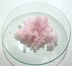 Common oxidation states of manganese are +2, +3, +4, +6, and +7, although all oxidation states from −3 to +7 have been observed. Manganese in oxidation state +7 is represented by salts of the intensely purple permanganate anion MnO−4.[28] Potassium permanganate is a commonly used laboratory reagent because of its oxidizing properties; it is used as a topical medicine (for example, in the treatment of fish diseases). Solutions of potassium permanganate were among the first stains and fixatives to be used in the preparation of biological cells and tissues for electron microscopy.[29]