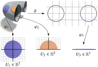 A manifold with boundary is a manifold with an edge. For example, a disk (circle plus interior) is a 2-manifold with as boundary the circle, a 1-manifold. The boundary of an -manifold with boundary is an -manifold. In three dimensions, a ball (sphere plus interior) is a 3-manifold with boundary. Its boundary is a sphere, a 2-manifold.