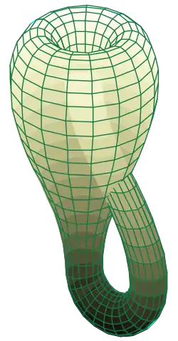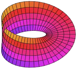 Begin with an infinite circular cylinder standing vertically, a manifold without boundary. Slice across it high and low to produce two circular boundaries, and the cylindrical strip between them. This is an orientable manifold with boundary, upon which "surgery" will be performed. Slice the strip open, so that it could unroll to become a rectangle, but keep a grasp on the cut ends. Twist one end 180°, making the inner surface face out, and glue the ends back together seamlessly. This results in a strip with a permanent half-twist: the Möbius strip. Its boundary is no longer a pair of circles, but (topologically) a single circle; and what was once its "inside" has merged with its "outside", so that it now has only a single side. Similarly to the Klein Bottle below, this two dimensional surface would need to intersect itself in two dimensions, but can easily be constructed in three or more dimensions.