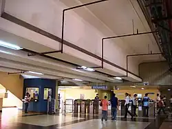 The concourse area at LRTA stations typically contain a passenger assistance office (PAO), ticket purchasing areas (ticket counters and/or ticket machines), and at least one stall that sells food and drinks.[52] Terminal stations also have a public relations office.[53] Stores and ATMs are usually found at street level outside the station, although there are instances where they can be found within the concourse.[11] Some stations, such as Monumento, Libertad and Araneta Center-Cubao, are directly connected to shopping malls.[13]