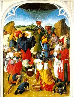 According to the Talmud, manna was found near the homes of those with strong belief in God, and far from the homes of those with doubts;[39] indeed, one classical midrash says that manna was intangible to Gentiles, as it would inevitably slip from their hands.[40] The Midrash Tanhuma holds that manna melted, formed liquid streams, was drunk by animals, flavored the animal flesh, and was thus indirectly eaten by Gentiles, this being the only way that Gentiles could taste manna.[41]