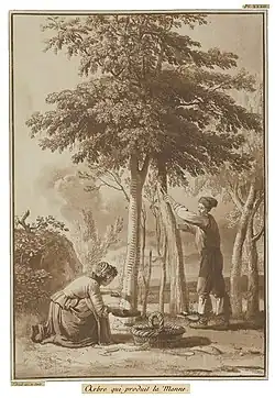In a modern botanical context, manna is often used to refer to the secretions of various plants, especially of certain shrubs and trees, and in particular the sugars obtained by evaporating the sap of the manna ash, extracted by making small cuts in the bark.[60] The manna ash, native to Southern Europe and Southwest Asia, produces a blue-green sap, which has medicinal value as a mild laxative,[61] demulcent, and weak expectorant.[58]