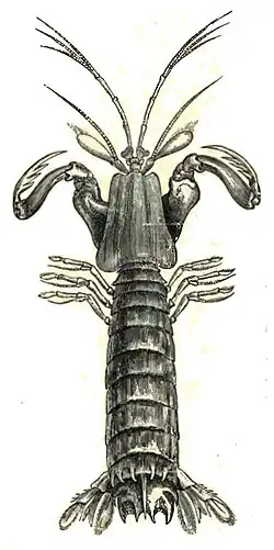 Drawing of a mantis shrimp by Richard Lydekker. The folded raptorial claws are flanking the carapace.