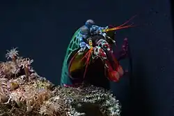 Mantis shrimp can perceive wavelengths of light ranging from deep ultraviolet (300 nm) to far-red (720 nm) and polarised light.[20][28] In mantis shrimp in the superfamilies Gonodactyloidea, Lysiosquilloidea, and Hemisquilloidea, the midband is made up of six ommatidial rows. Rows 1 to 4 process colours, while rows 5 and 6 detect circularly or linearly polarised light. Twelve types of photoreceptor cells are in rows 1 to 4, four of which detect ultraviolet light.[19][20][28][29] Despite the impressive range of wavelengths that mantis shrimp have the ability to see, they do not have the ability to discriminate wavelengths less than 25 nm apart. It is suggested that not discriminating between closely positioned wavelengths allows these organisms to make determinations of its surroundings with little processing delay. Having little delay in evaluating surroundings is important for mantis shrimp, since they are territorial and frequently in combat.[28] However, some mantis shrimp have been found capable of distinguishing between high-saturation and low-saturation colors.[30]
