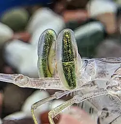 Mantis shrimp typically grow to around 10 cm (3.9 in) in length, while a few species such as the zebra mantis shrimp can reach up to 38 cm (15 in).[7] A mantis shrimp's carapace covers only the rear part of the head and the first four segments of the thorax. Mantis shrimp widely range in colour, with species mostly being shades of brown, while others have multiple contrasting, vivid colours.