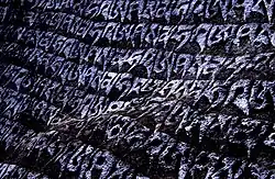 One of the most ancient Buddhist mantras is the famous Pratītyasamutpāda-gāthā, also known as the dependent origination dhāraṇī. This phrase is said to encapsulate the meaning of the Buddha's Teaching. It was a popular Buddhist verse and was used as a mantra.[74] This mantra is found inscribed on numerous ancient Buddhist statues, chaityas, and images.[75][76]