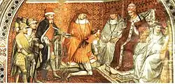 Encouraged by the success, Manuel dreamed of the restoration of the Roman Empire, at the cost of union between the Orthodox and the Catholic Church, a prospect which would frequently be offered to the Pope during negotiations and plans for alliance.[43] If there was ever a chance of reuniting the eastern and western churches, and coming to reconciliation with the Pope permanently, this was probably the most favourable moment. The Papacy was never on good terms with the Normans, except when under duress by the threat of direct military action. Having the "civilised" Byzantines on its southern border was infinitely preferable to the Papacy than having to constantly deal with the troublesome Normans of Sicily. It was in the interest of Pope Adrian IV to reach a deal if at all possible, since doing so would greatly increase his own influence over the entire Orthodox Christian population. Manuel offered a large sum of money to the Pope for the provision of troops, with the request that the Pope grant the Byzantine emperor lordship of three maritime cities in return for assistance in expelling William from Sicily. Manuel also promised to pay 5,000 pounds of gold to the Pope and the Curia.[44] Negotiations were hurriedly carried out, and an alliance was formed between Manuel and Hadrian.[40]