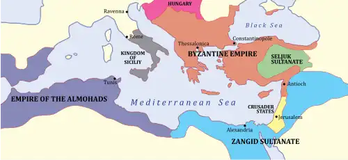 Despite the bad feelings generated at Damietta, Amalric still refused to abandon his dream of conquering Egypt, and he continued to seek good relations with the Byzantines in the hopes of another joined attack, which never took place.[74] In 1171 Amalric came to Constantinople in person, after Egypt had fallen to Saladin. Manuel was thus able to organise a grand ceremonial reception which both honoured Amalric and underlined his dependence: for the rest of Amalric's reign, Jerusalem was a Byzantine satellite, and Manuel was able to act as a protector of the Holy Places, exerting a growing influence in the Kingdom of Jerusalem.[75] In 1177, a fleet of 150 ships was sent by Manuel I to invade Egypt, but returned home after appearing off Acre due to the refusal of Count Philip of Flanders and many important nobles of the Kingdom of Jerusalem to help.[76]