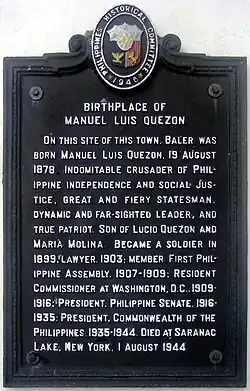 National historical marker installed in 1948 in Baler at the site of his birthplace.