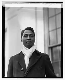 In early 1930, Roxas flew to the United States with Sergio Osmeña to lobby the U.S. Congress to go slow on the granting of independence in the Hare-Hawes-Cutting Bill.[11] Aside from the fear of Japan, many Filipinos were deeply worried about the plans to impose heavy tariffs on Filipino agriculture after independence, which provided another reason to go slowly with independence.[11] In Washington, Roxas lobbied U.S. government leaders such as Secretary of State Henry Stimson and Secretary of War Patrick Hurley.[13] Roxas testified before the U.S. Congress that he favored Philippine independence, saying the Filipinos had fulfilled the "stable government" provision of the Jones Act of 1916, which mandated that independence be granted when Filipinos proved that they had a "stable government".[14] However, Roxas went on to testify that "with the granting of tariff autonomy, serious difficulties may arise".[14] In common with the rest of the Filipino elite, Roxas saw the plans of the U.S. Congress to impose tariffs on Filipino goods after independence as an economic disaster for the Philippines.[14]
