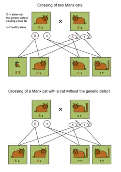 The Manx taillessness gene is dominant and highly penetrant; kittens from two Manx parents are generally born without any tail. Being homozygous for (having two copies of) the gene is usually lethal in utero, resulting in miscarriage.[7][8] Thus, tailless cats can carry only one copy of the gene. Because of the danger of having two copies of the taillessness gene, breeders avoid breeding two entirely tailless Manx cats together.[42] Because neither parent carries the tailless allele, a fully tailed Manx bred to another fully tailed Manx results in all fully tailed kittens.