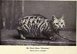 Manx cats have been exhibited in cat shows, as a named, distinct breed (and with the modern spelling "Manx"), since the late 1800s. In that era, few shows provided a Manx division, and exhibited specimens were usually entered under the "Any Other Variety" class, where they often could not compete well unless "exceptionally good in size and markings".[18] Early pet breeding and showing expert Charles Henry Lane, himself the owner of a prize-winning rare white rumpy Manx named Lord Luke, published the first known (albeit informal) breed standard for the Manx in his 1903 Rabbits, Cats and Cavies,[18] but noted that already by the time of his writing "if the judge understood the variety" a Manx would be clearly distinguishable from some other tailless cat being exhibited, "as the make of the animal, its movements and its general character are all distinctive."[18] Not all cat experts of the day were favourable toward the breed; in The Cat: Its Points and Management in Health and Disease, Frank Townend Barton wrote in 1908: "There is nothing whatever to recommend the breed, whilst the loss of the tail in no way enhances its beauty."[4]