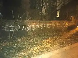 "Long live Chairman Mao! Long live Chairman Gonzalo! Long live the theory of protracted people's war!" (毛主席万岁!贡萨罗主席万岁!持久人民战争理论万岁!) New Leftist graffiti on a wall at Qinghua South Road, Beijing, 6 December 2021.