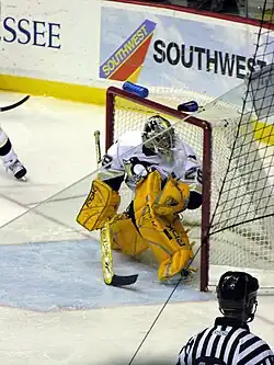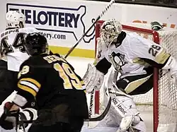 As NHL play was postponed due to the labour dispute, Fleury continued to play with Wilkes-Barre/Scranton in 2004–05, where he posted a 26–19–4 record, a 2.52 goals against average and a .901 save percentage.[15] When NHL play resumed in 2005–06, Fleury started the season once more in the minors, but was quickly called up by Pittsburgh for a game against the Buffalo Sabres on October 10 to replace an injured Jocelyn Thibault.[16] He continued to play between Wilkes-Barre/Scranton and Pittsburgh until November 28, after which he remained with Pittsburgh.[17] With the Penguins finishing last in the Eastern Conference and allowing a league-worst 316 goals,[18] Fleury recorded a 3.25 goals against average and a .898 save percentage.[19] Competing for time with Sébastien Caron and Jocelyn Thibault, Fleury emerged as the Penguins' starting goalie.[20][21][22]