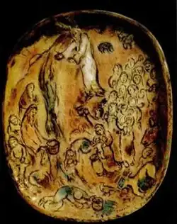 Art critic Robert Hughes referred to Chagall as "the quintessential Jewish artist of the twentieth century". According to art historian Michael J. Lewis, Chagall was considered to be "the last survivor of the first generation of European modernists". For decades, he "had also been respected as the world's pre-eminent Jewish artist".[29] Using the medium of stained glass, he produced windows for the cathedrals of Reims and Metz as well as the Fraumünster in Zürich, windows for the UN and the Art Institute of Chicago and the Jerusalem Windows in Israel. He also did large-scale paintings, including part of the ceiling of the Paris Opéra. He experienced modernism's "golden age" in Paris, where "he synthesized the art forms of Cubism, Symbolism, and Fauvism, and the influence of Fauvism gave rise to Surrealism". Yet throughout these phases of his style he remained "most emphatically a Jewish artist, whose work was one long dreamy reverie of life in his native Vitebsk."[30] "When Matisse dies", Pablo Picasso remarked in the 1950s, "Chagall will be the only painter left who understands what colour really is".[31]