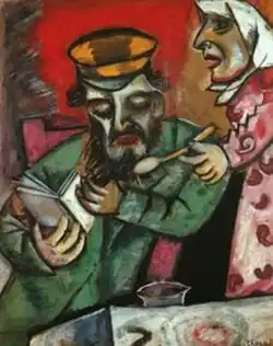 Chagall's art can be understood as the response to a situation that has long marked the history of Russian Jews. Though they were cultural innovators who made important contributions to the broader society, Jews were considered outsiders in a frequently hostile society ... Chagall himself was born of a family steeped in religious life; his parents were observant Hasidic Jews who found spiritual satisfaction in a life defined by their faith and organized by prayer.[41]
