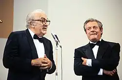 Despite international acclaim, Mastroianni largely shunned Hollywood, and remained a quintessentially Italian thespian for the majority of his career.[8] He was the first actor to receive an Academy Award nomination for a non-English language performance, and was nominated for Best Actor three times – Divorce Italian Style (1961), A Special Day (1977), and Dark Eyes (1987). He was one of only three actors, the others being Jack Lemmon and Dean Stockwell, to win the prestigious Cannes Film Festival Award for Best Actor twice. Mastroianni's contributions to Italian art and culture saw him receive multiple civil honours, including the Order of Merit of the Italian Republic, the highest-ranking knighthood of the country.[9]
